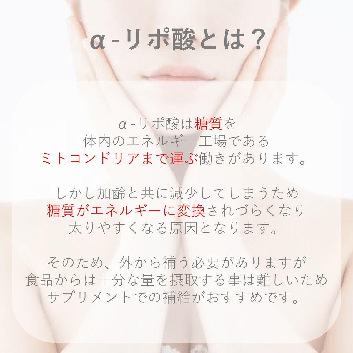 α-リポ酸は細胞のミトコンドリアに存在し、体内でエネルギーを作り出す補酵素として働く成分です。