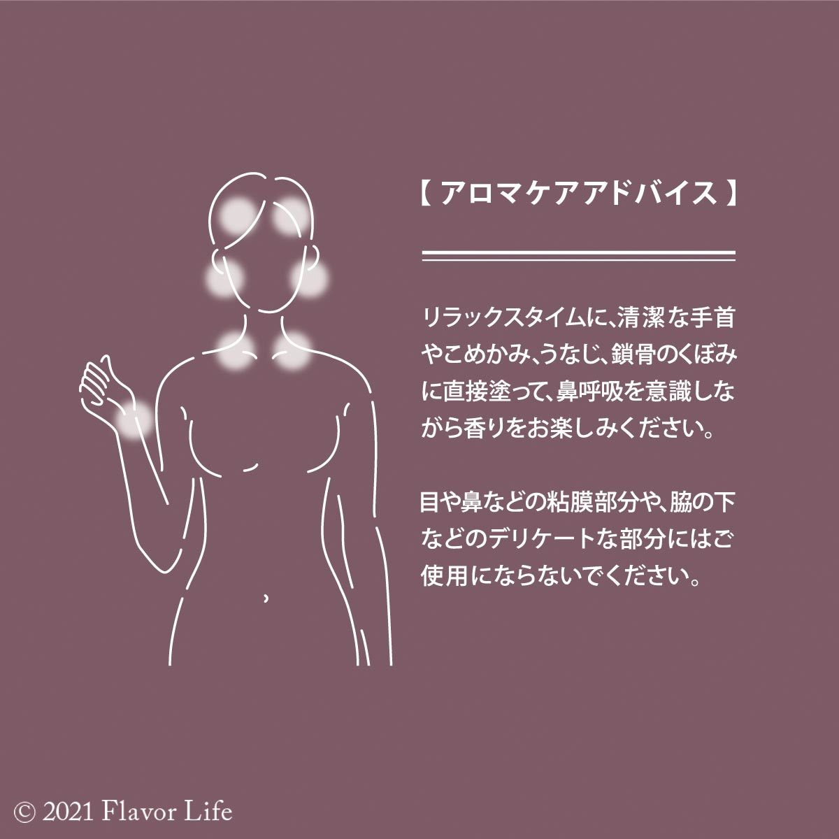 リラックスタイムに、清潔な手首やこめかみ、うなじ、鎖骨のくぼみに直接塗って、鼻呼吸を意識しながら香りをお楽しみください。