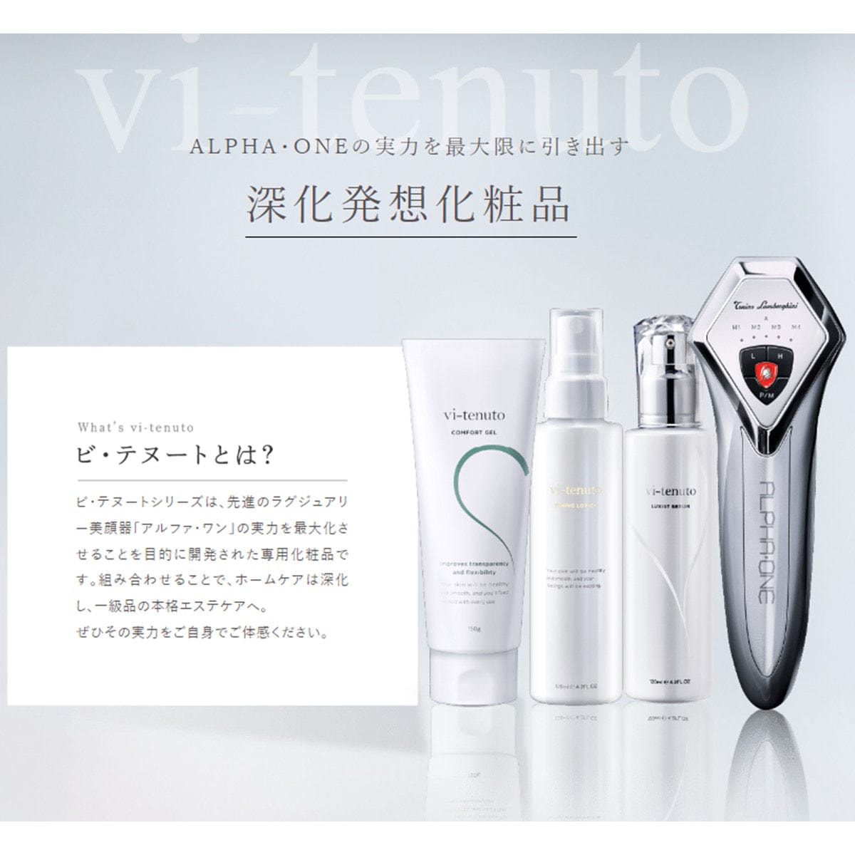 大ヒット商品である、エニシーシリーズの炭酸ガスパック『グローパック』を筆頭に、ラグジュアリーブランド『トニーノ・ランボルギーニ』と共同開発した美顔器・ALPHA・ONEなど、独自の美容商材を通して『感動』を、“キレイになりたい”という願いに『結果』で応え続けています。